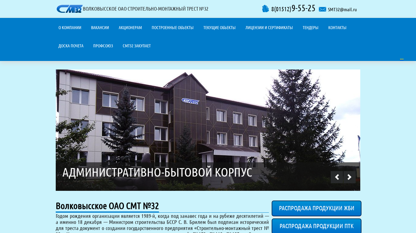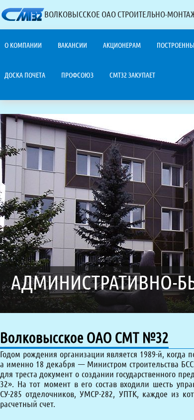 This website belongs to Волковысское ОАО "Строительно-монтажный трест №32" (SMT32), a Belarusian construction company founded in 1989. The company was created as a state enterprise and initially consisted of six branches with separate accounting departments and bank accounts. The first operational unit, строительное управление №173, was established in 1971. In 1994, the company transformed into an Open Joint Stock Company (OAO). SMT32 specializes in full-scale construction projects, including social, cultural, residential, and production facilities, as well as the production of building materials. The company is open to partnerships and has a focus on delivering construction projects of various complexities "under one roof." Keywords: Волковысское ОАO, Строительно