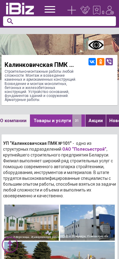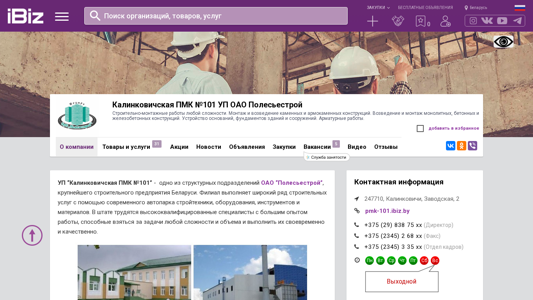 | AI-анализ | <!--------------------------------------------------------------------------------------------------> The website belongs to Калинковичская ПМК №101 УП ОАО Полесьестрой, a structural unit of OAO “Полесьестрой,” one of the largest construction companies in Belarus. The site offers a range of construction services using a modern fleet of construction machinery, equipment, instruments, and materials. The team consists of highly qualified specialists with extensive experience in handling complex and large-scale projects, ensuring timely and quality completion. Services provided by УП “Калинковичская ПМК № 101” OAO “Полесьестрой” include: construction and mounting works; construction of stone and armored stone structures; construction of monolithic, reinforced concrete, and ferroconcrete structures; foundation and basement construction; and armature works. Additionally, the company |