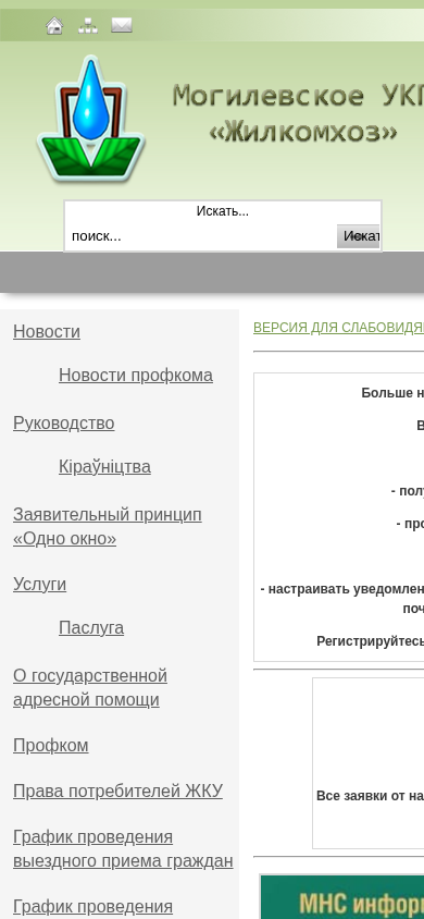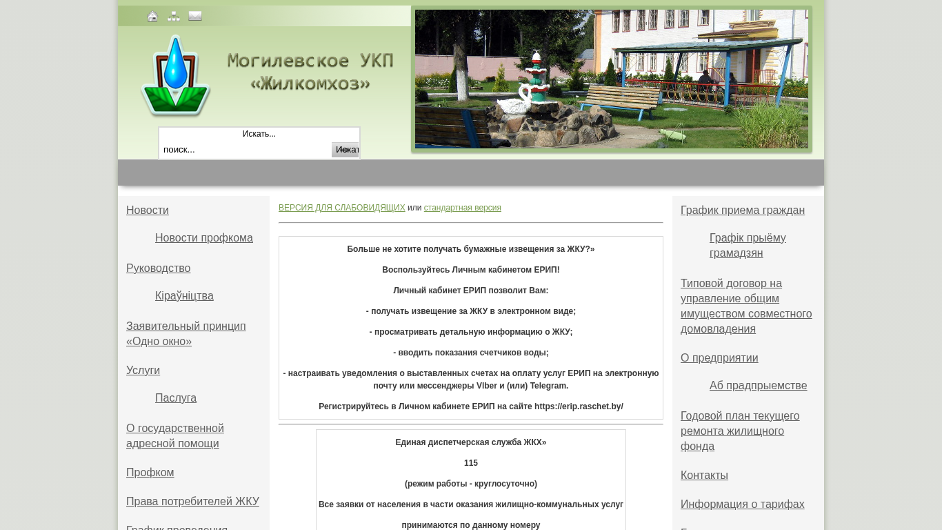 | AI-анализ | This website belongs to the Мogilevское УКП «Жилкомхоз» (Mogilev Housing and Communal Services Enterprise), providing housing and communal services in Mogilev, Belarus. The homepage includes sections for news, services, information on administrative procedures, contacts, and social standards. The website is multilingual, requiring JavaScript for its GTranslate feature and translation delivery network. Notable topics include the single window principle, electronic applications, and anti-terrorism and extremism measures. Users can also access information about the organization, vacancies, and a typical tenancy agreement. The site includes a section for the president of Belarus, as well as a rating-based version for users with slower internet connections. The site also offers an electronic reception system (ЕРИП) for users to receive information and manage their accounts electronically. The main contact number for |
