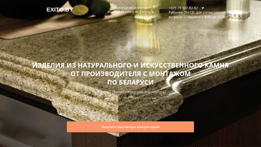 | AI-анализ | The portal Exito.BY is a Belarusian production and installation company specializing in the manufacture and mounting of stone countertops, backsplashes, fireplaces, and stairs from both natural and artificial stone. With seven years of experience, they offer services across Belarus. Keywords include 'stone countertops, fireplaces, backsplashes, stairs, granite, marble, quartz, quartz agglomerate, stone countertops from stone, artificial stone, natural stone'. The top words on the site are 'камня' (stone), 'беларуси' (Belarus), 'звоните' (call), 'раздел' (section), 'производство' (production), and 'получить' (get). The site features sections on elite fireplaces, stone countertops, and stairs, but some sections are |