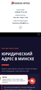 | AI-анализ | The web project "Юридический адress" (Legal Address) is a business services provider based in Minsk, Belarus. The website offers a legal address registration for businesses, with the possibility to obtain a guarantee letter within 20 minutes of application. The site also provides regular mail handling and storage services, all without hidden fees. The company owns all its premises and covers all associated costs, including taxes and utilities. The site offers offices in all districts of Minsk, with pricing starting at 71 BYN per month for one month, and flexible payment terms. The site also mentions a "no-commitment" contract option and the absence of penalties for early contract termination. The site is available in Belarusian, with some English translations for keywords and top words. |