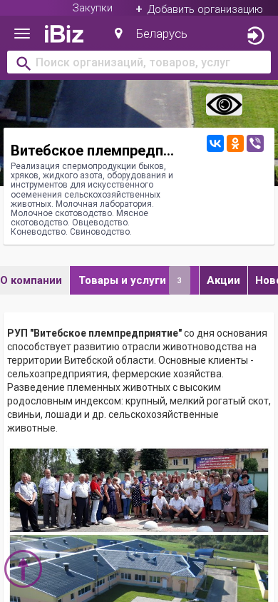 | AI-анализ | This website is a livestock breeding organization, "Vitebskoe Plempredpriyatie RUP," located in Vitsebsk, Belarus, at 1-y Shumilinskij Per. 1. The organization specializes in the sale of sperm products from bulls and boars, as well as liquid nitrogen, equipment, and instruments for artificial insemination of farm animals. There is also a milk laboratory and the organization deals with dairy, meat, sheep, horse, and pig farming. The website provides free classified ads for purchases and offers a section for company information, products, and services. The main clients are agricultural enterprises and farmer cooperatives. The organization breeds livestock with high pedigree indexes, including cattle, swine, horses, and others. The company's offerings include sperm products from bull and boar |