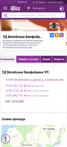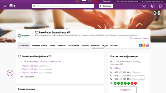 | AI-анализ | --- This website is for ТД Витебская Биофабрика УП, a daughter company of БелВитунифарма, specializing in the development of a retail chain of veterinary pharmacies named Добрый ветеринар, and the sale of veterinary preparations. The website includes contact information, including phone numbers and address at 211309, Должа д., Советская, 26A in Belarus. The company offers products and services related to veterinary preparations, with sections for production and sales, news, job postings, videos, and customer reviews. The company's contact details include a director and several sales departments, with phone numbers +375 (29) 151 88 xx, +375 (212) 20 94 xx, and +3 |