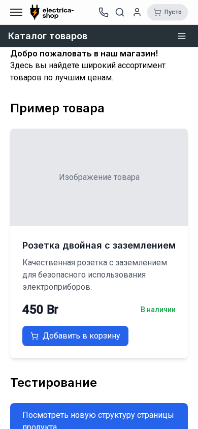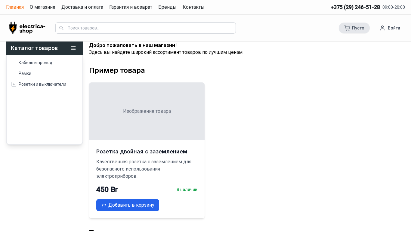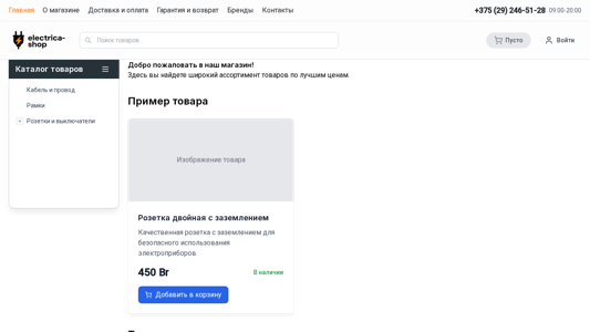 | SEO-описание | Electrica Shop — розетки, выключатели, светильники, кабели, щитки и автоматы. Качественные электротовары с доставкой по всей Беларуси! |