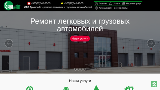 | SEO-описание | СТО Гринлайт - ремонт легковых и грузовых автомобилей в ВитебскеСТО - сочетание доступной цены, надежности и высочайшего сервиса. Компьютерная диагностика, замена расходников, ремонт автоэлектрики, двигателя, подвески, подготовка авто к ТО – на нашем СТО производится ремонт и грузовых, и легковых авто любых марок. |