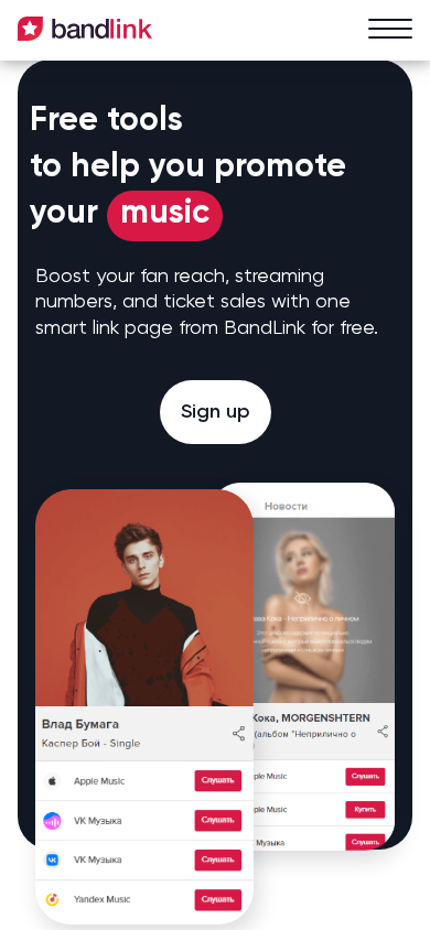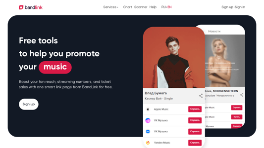| AI-анализ | This online resource, titled "BandLink," offers free tools to help artists, labels, bloggers, and podcasters promote their music. Users can sign up for an account without requiring special skills or much time. BandLink makes promotion fast and easy by providing a simple link page where fans can access multiple streaming and download options for an artist's releases. The service includes templates for various types of content, such as releases, concerts, and tours. Users can build a custom artist bio page with a news feed, links to releases, social networks, concert and tour schedules, photo and video galleries, and detailed page visit metrics and fan engagement measurement. Additionally, BandLink offers a scanner feature to help users find their tracks in editorial playlists on Yandex Music and stay updated on playlist changes. The resource is available in both Russian and English, and as of the provided data, it had 550 artists |