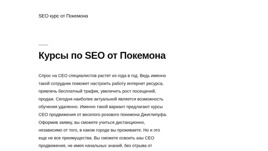 | AI-анализ | The website offers SEO courses from Pokemon's Djiglipuf. With the increasing demand for SEO specialists, having such an employee can help optimize the work of an internet resource, attract free traffic, increase visitor growth, and sales. Today, remote learning is the most relevant option. The SEO promotion courses from the cheerful pink Pokemon Djiglipuf allow you to learn remotely, regardless of where you live. You can also learn SEO theory and practice without prior knowledge, interrupting your regular work or dealing with other educational institutions in the country or abroad. The SEO courses aim to provide you with the skills to build a career in several directions, allowing you to work both in-house and remotely, not just in Russia but in other countries as well. Former students of these courses work as SEO specialists in various companies. The existence of numerous SEO studios worldwide, which website owners turn to for help in |