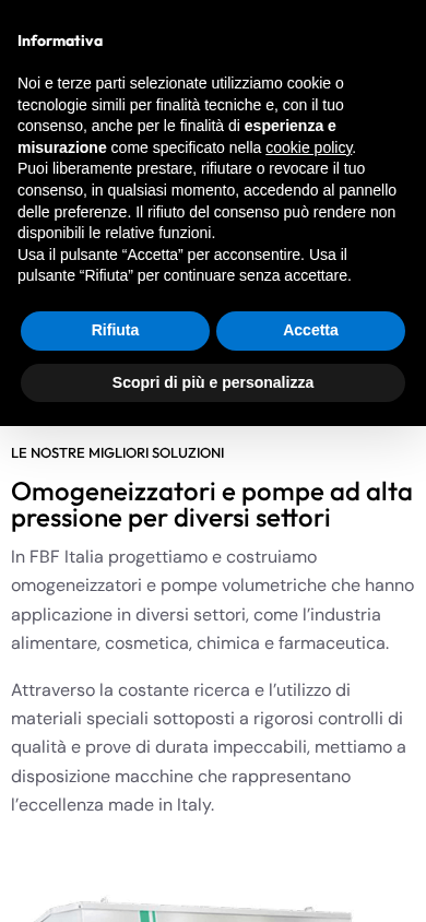 | SEO-описание | FBF Italia progetta e costruisce omogeneizzatori industriali e pompe ad alta pressione applicabili in diversi settori industriali. |