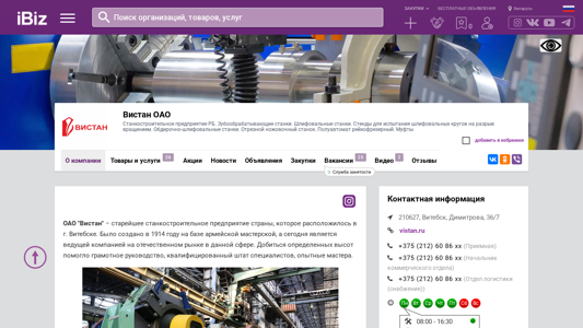 | AI-анализ | The web project "Vistan OAO" is a Belarusian industrial company specializing in the production and sale of various types of machinery. Established in 1914, it is one of the oldest and leading companies in the field of metalworking in Belarus. The company's portfolio includes zuboobrabatyvaющие (toothing) machines, shlifovalywnye (grinding) machines, test stands for grinding wheels, obdirochno-shlifovalywnye (grinding and deburring) machines, a cutting bench, a semiautomatic rail milling machine, and mufty (couplings). The company's address is 210627, Dimitrova Street 36/7, in Vitsebsk, Belarus. |