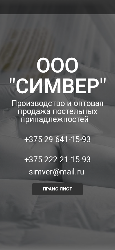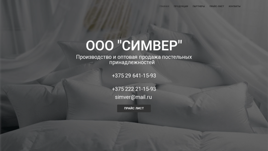 | AI-анализ | The portal SimVer — Your ideal sleep This Belarusian website, SimVer.by, specializes in the production and sale of bedding accessories. The online shop offers a range of products including down and feather pillows, woolen blankets, synthetic fiber fillers, and covers for pillows. The company, OOO "SimVer," can be contacted via phone at +375 29 641-15-93 or +375 222 21-15-93 or by email at simver@mail.ru. The price list and product information are accessible on the site. The company is located in Mogilev, Belarus, at the address 212001, per. Basny, 3A, on the "Agromashservis" base. The shop's hours of operation are |