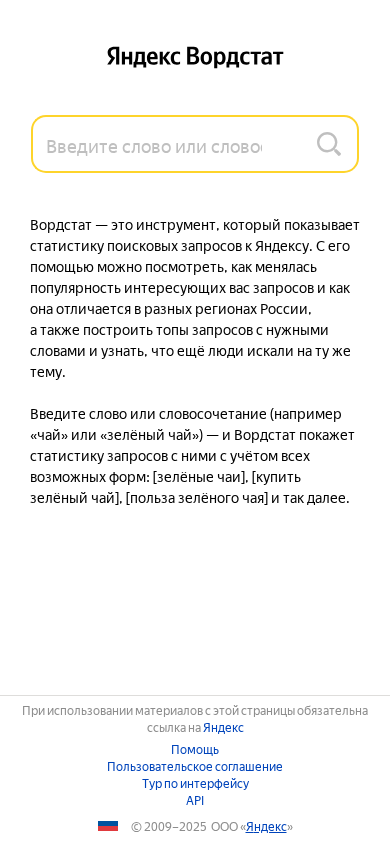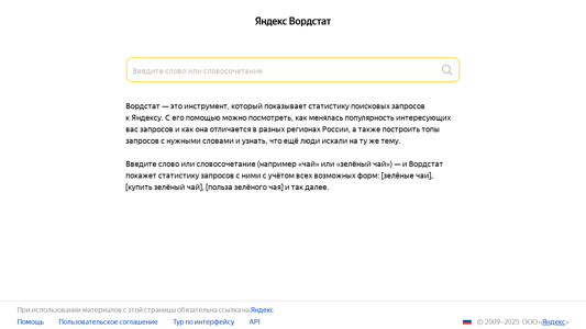 | AI-анализ | The website Wordstat is a tool that displays search query statistics to Yandex. It enables users to view how the popularity of their queries has changed and how it differs in various regions of Russia. Additionally, users can build topic-specific top queries and learn about other queries related to the same subject. Enter a word or phrase (e.g., "tea" or "green tea") to see the statistics for queries containing that term, including various forms such as "green teas," "buy green tea," and "benefits of green tea." Wordstat is a service provided by Yandex. |