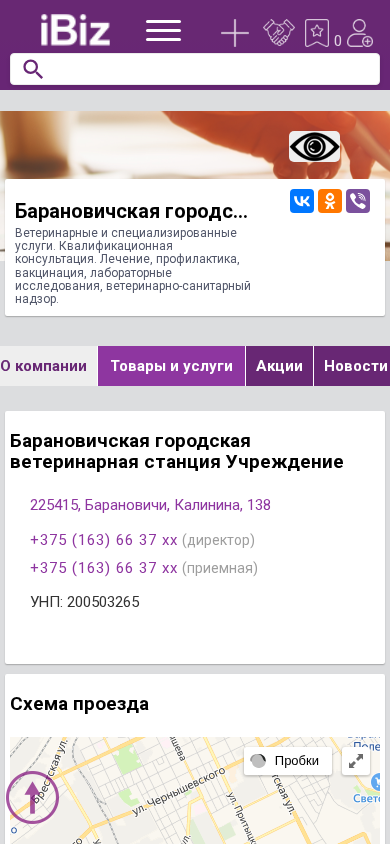 | Название / Заголовок | Барановичская городская ветеринарная станция Учреждение - Ветеринарные и специализированные услуги. Квалификационная консультация. Лечение, профилактика, вакцинация, лабораторные исследования, ветеринарно-санитарный надзор.. 225415, Барановичи, , Калинина, 138 |