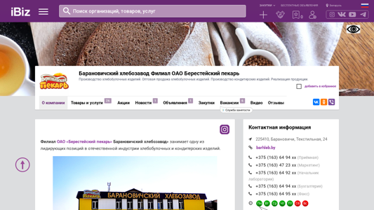 | AI-анализ | --- This online resource is dedicated to Baranovichsky Hleboprav Factory, a branch of OAO Beresteyskiy Pekar, which specializes in the production of bread and baked goods. The website provides information on optoelectronic sales of these products, as well as the production of confectionery items and their distribution. The address and contact telephone numbers for Baranovichsky Hleboprav Factory can be found on the website, along with details of current job vacancies. The main keywords associated with this resource include 'production', 'bread', 'baked goods', 'confectionery', and 'sales'. |