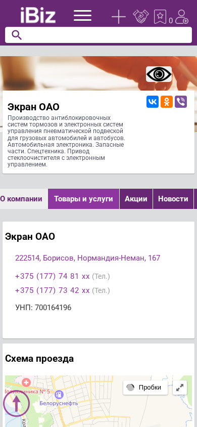 | Название / Заголовок | Экран ОАО - Производство антиблокировочных систем тормозов и электронных систем управления пневматической подвеской для грузовых автомобилей и автобусов. Автомобильная электроника. Запасные части. Спецтехника. Привод стеклоочистителя с электронным управлением.. 222514, Борисов, , Нормандия-Неман, 167 |