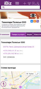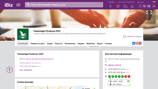 | AI-анализ | The web project "Technopark Polesie OOO" is a business support organization located in Pinsk, Belarus, at Dneprowskaya Flotilii 23. The website provides information about the company, its location, and contact details, including phone numbers +375 (165) 31 31 xx and +375 (29) 532 08 xx. The company offers support for innovative businesses and aims to create favorable conditions for their organization and development. The website includes sections for news, announcements, vacancies, and customer reviews on social media platforms such as VKontakte and Odnoklassniki. The business hours are Monday to Friday from 9:00 to 18:00, except for weekends. The website also includes a map for directions and a public agreement. The |