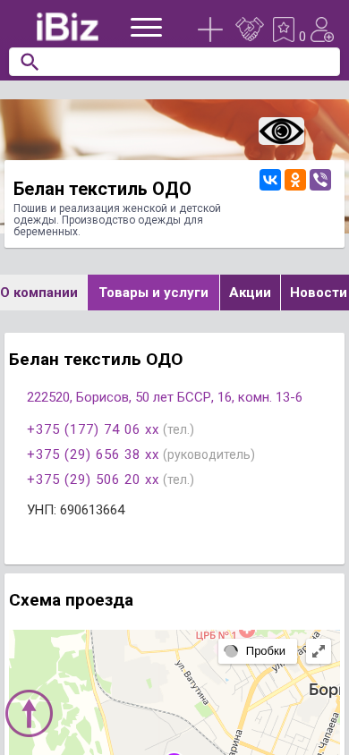 | Название / Заголовок | Белан текстиль ОДО - Пошив и реализация женской и детской одежды. Производство одежды для беременных.. 222520, Борисов, , 50 лет БССР, 16, комн. 13-6 |