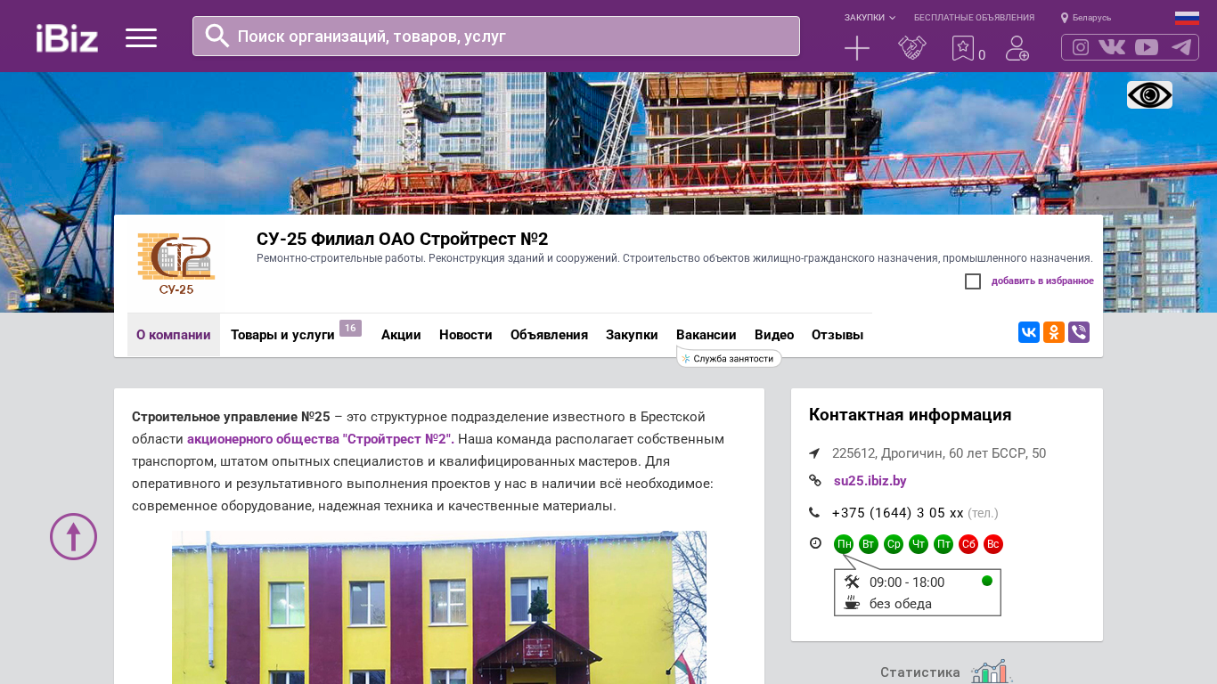 | Название / Заголовок | СУ-25 Филиал ОАО Стройтрест №2 - Ремонтно-строительные работы. Реконструкция зданий и сооружений. Строительство объектов жилищно-гражданского назначения, промышленного назначения.. 225612, Дрогичин, , 60 лет БССР, 50 |