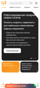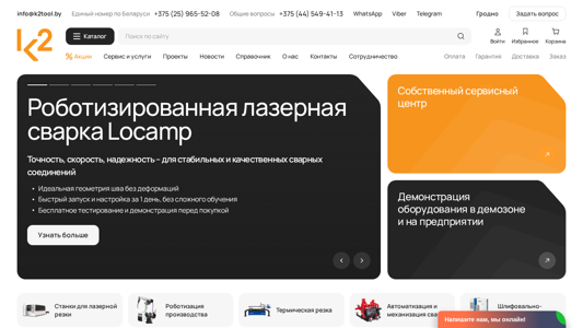 | AI-анализ | The portal K2 Технологии is a comprehensive industrial equipment marketplace specializing in metalworking machinery and tools. With a title translating to "K2 Technologies – Industrial Equipment for Metal Processing," the website offers a wide range of products including metalworking machines, laser equipment, welding machines, thermal cutting equipment, press machines, sheet metal working machines, tube and profile processing machines, robotic production systems, compressors, lifting equipment, construction equipment, pneumatic and electric tools, and various accessories. The site features 2955 products, including sveril'nye staniki (sveril'nye stanovia in English, meaning 'sveriling machines' or 'drilling machines') and their accessories, as well as shlifovalye staniki (shlifovalye stanovia in English, meaning 'shaving machines' or 'grinding machines') and their |