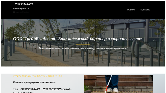 | AI-анализ | --- This online resource is dedicated to selling tactile paving stones. The title of the website is "Тактильная плитка" (Tactile Paving), and the description includes phrases such as "Купить тактильную плитку" (Buy Tactile Paving) and "тактильная плитка" (tactile paving) multiple times. The keywords include "тактильная" (tactile), "плитка" (paving), and "плитки" (paving stones), among others. The contact information for the company, OOO "ТрейдБелАвеню" (Trade Belarus), is provided, along with their phone numbers and email address. The website offers various types of tactile paving, including warning and guiding paving stones, and provides specifications such |