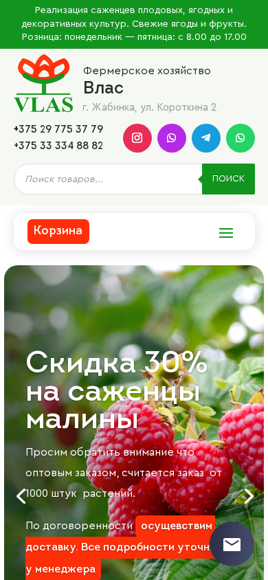 | AI-анализ | The website is a farm business, named 'Фермерское хозяйство Влас' (Farm Business 'Vlas'), offering the sale of saplings of fruit, berry and decorative plants, as well as fresh fruits and berries in retail. The farm is located in Belarus, specifically in the Brest region, in the Žabinka district, at the address Ulitsa Korotkina 2. The retail hours are from Monday to Friday, between 8:00 and 17:00. The website provides contact information, including phone numbers and an email address, for customers to place orders or inquire about the catalog. The farm offers discounts on bulk orders, with a 30% discount on orders of 1000 saplings of raspberries, a 20% discount on orders of 1000 saplings of cranberries |