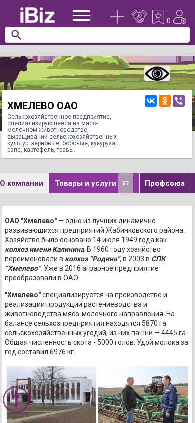 | AI-анализ | --- The portal xmelevo.ibiz.by is a farming enterprise specializing in meat-dairy livestock farming and cultivation of various agricultural products including grains, legumes, corn, rapeseed, potatoes, and grasses. The company is located in Hmelevo, Belarus, and its address is Centralna Street, Hmelevo ag., 225127. The website provides information on company news, products and services, and offers free classified ads for purchases. OAO "Hmelevo" was founded in 1949 as a collective farm named after Kalinin, was later renamed to SKP "Hmelevo" in 2003, and was transformed into an agricultural organization in 2016. The enterprise manages 5,870 ha of agricultural land, of which 4,44 |