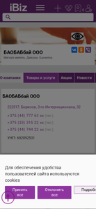 | AI-анализ | The website is a Belarusian e-commerce platform specializing in soft furniture sales. The company, Baobab OOO, is located in Borisov, Belarus, at 3-го Интернационала, 32. The contact details provided include three phone numbers and the company's Unified State Register number (УНП). The website offers various furniture items such as sofas, armchairs, and tables, as well as services like deliveries and installations. Users can create their own map to find the company's location and check traffic conditions. The website also features a section for company news, job vacancies, and customer reviews on social media platforms. The company operates from Monday to Friday, 9:00 AM to 6:00 PM, with no lunch break. |