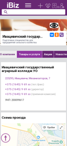 | AI-анализ | The website is the official site for Ivacevich State Agricultural College UO, which offers specialized education for agricultural businesses. Located at Механизаторов, 7, Ивацевичи, 225295, the college provides training in various agricultural fields. The site includes contact information, such as phone numbers for the college, director, and admissions commission. The company's UNP number is 200099617. Visitors can find directions to the college, operating hours, and a contact form. The site also features news, announcements, vacancies, and student reviews on social media platforms. The website is categorized under 'Colleges, technicums, lyceums' and 'Colleges, technicums, lyceums in Ivacevich'. |