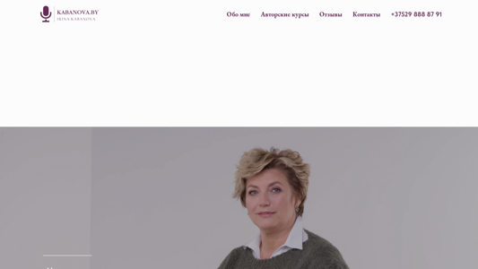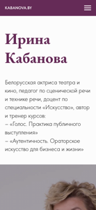 | AI-анализ | This website, titled Kabanova.by, belongs to Irina Kabanova, a Belarusian actress in theatre and cinema, and a pedagogue specializing in scenic speech and voice technique. She is a doctor of arts and has been teaching for over 27 years. Kabanova graduated from the Belarusian State Theatre and Art Institute (BGAI) in 1988, majoring in puppet theatre acting. From 1988 to 1993, she worked as an actress at the Mogilev Regional Drama and Comedy Theatre named after V.I. Dunin-Marcinkevich. From 2002 to 2017, she served as the head of the Scenic Speech and Vocal Department at BGAI. The website provides information about her author's courses, which include "V |