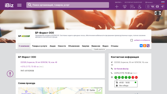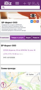 | AI-анализ | The web project "BR-Forest OOO - Predpriyatie holdinga BORWOOD" is a Belarusian company located in Borisov, providing forestry services including the harvesting of raw materials in rented forests, ensuring mobility for production tasks, and fully utilizing the rented forestry estate. The company contact information and map scheme are available on the website. The website also offers information on products and services related to forestry, such as forestry equipment and wood processing. The business hours are from 09:00 to 18:00, Monday to Friday, with weekends being holidays. The company can be reached by phone at +375 (177) 73 00 xx. The Unified State Register number is 691929058. |