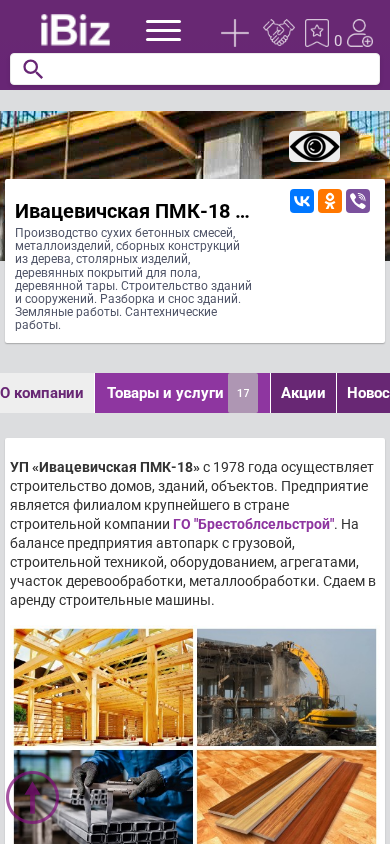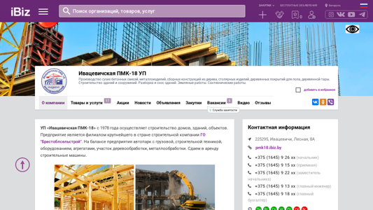 Название / Заголовок | Ивацевичская ПМК-18 УП - Производство сухих бетонных смесей, металлоизделий, сборных конструкций из дерева, столярных изделий, деревянных покрытий для пола, деревянной тары. Строительство зданий и сооружений. Разборка и снос зданий. Земляные работы. Сантехнические работы.. 225295, Ивацевичи, , Лесная, 8А |