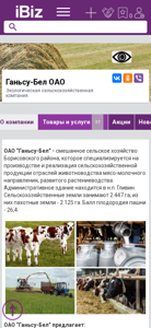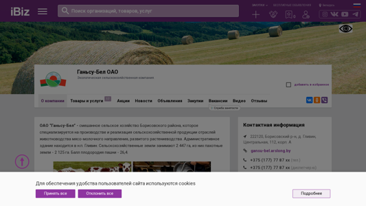 | AI-анализ | The website is for Gan'su-Bel OAO, an ecological agricultural company located in Borisovsky district, Belarus. The company specializes in the production and sale of agricultural products from the livestock and dairy sectors, as well as developed crop farming. The administrative building is situated in the settlement of Glyvin. The agricultural lands cover an area of 2,447 ha, with 2,125 ha used for farming. The soil fertility index is 26.4. Gan'su-Bel OAO offers products including grain, rapeseed, milk, beef, and green fodder. The company operates two production sites, consisting of three dairy and livestock farms, three farms for raising cattle, and supporting structures. To efficiently and effectively work the land, the farm has tractors, automobiles, and agricultural machinery at its |
