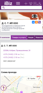 | AI-анализ | The website is a business platform for the company D.S.T. IP OOO, offering expedited and transport services for cargo in international and domestic shipping. The company's contact information, including phone numbers and address, are provided, along with a map for easy access. The website offers various services such as cargo transportation, logistics, and delivery, and also features a section for company news and announcements. Users can add the company to their favorites, and there are options for contacting the company and leaving reviews on social media platforms. The website is categorized under 'Transportation Services and Expedited Cargo' and 'Transportation Services and Expedited Cargo in Cobrin'. The company's UNP number is 200041247. The website operates Monday to Friday from 9:00 AM to 6:00 PM, with no lunch break. The contact numbers |
