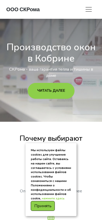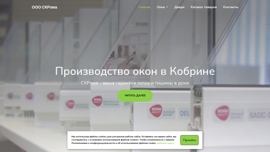 | AI-анализ | This online resource, titled "Главная | СКРома", is an e-commerce website for a Belarusian company named СКРома OОО. The website specializes in the production and sale of PVC windows and doors, as evidenced by the frequent use of related keywords such as "окон" (windows), "дверей" (doors), "пвх" (PVC), and "производства" (production). The company also offers installation services, as indicated by the keywords "установка" (installation) and "специалисты" (specialists). The website includes a catalog of products, customer contacts, and information about the company's production location in Кобрине. The company boasts over 15 years of experience in PVC window production and professional installation by specialists. The website offers a free quote and the option to |