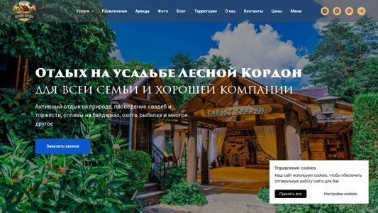 | AI-анализ | The website is for a recreational estate named Лесной Кордон (Lesny Korдон), which is located near Minsk, Belarus. The estate offers opportunities for leisure activities, organizing celebrations, and canoeing trips. Hunting in the surrounding forests adds adrenaline. The website also provides information on accommodations, including a large guest house for up to 45 guests, a smaller guest house for up to 26 guests, apartments for two, and a cozy cafe for up to 80 guests. The estate has a camping area, a children's playground, and a sports field. A nearby store, cafe, and pharmacy are within two kilometers. The estate's territory covers more than 4 hectares and features a parking lot for up to 15 cars, a barbecue area, and a Wi-Fi network |