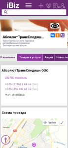 | AI-анализ | This website is a business platform for AbsolutTransSpedishn OOO, a transport services company located in Fanipol, Belarus (222750). The website offers information about the company's services, which include cargo transportation by truck and expeditor services. The homepage displays the company's contact information, including phone numbers, and a map showing the location. The website includes sections for company news, job vacancies, and customer reviews. Visitors can also access information about the company's products and services, such as auto transportation, promotions, and announcements. The website operates from Monday to Friday, from 9:00 AM to 6:00 PM, without lunch breaks on weekdays. The contact information includes the phone numbers +375 (1716) 2 64 xx and +375 (25) 74 |