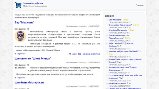 | AI-анализ | The web project "Consumer.by" is a personal blog featuring consumer reviews. The website's title is "Главная | Заметки потребителя" and the description is blank. The keywords include "f1mishutka," "2023," "опубликовано," "моя," "оценка," and various other words related to reviews and personal opinions. The top_words list indicates that the blog covers a variety of topics, such as a Mexican restaurant named "Бар Mexicana," a tire shop named "Шина Минск," a sewing workshop, a customs agency, and several cafes and restaurants. The blog's author writes subjectively about their experiences and does not sell reviews or guarantee objectivity. The main navigation includes "Главная," "Свежее," "Бар Mexicana," "Шиномонтаж Шина |