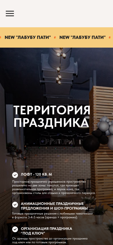 | SEO-описание | Пространство для праздников в Минске. Праздничные предложения в формате 3-5 часов по готовым программам. |