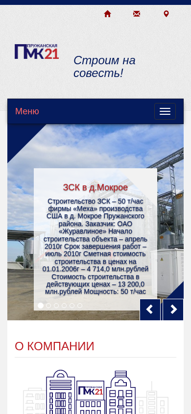 | AI-анализ | The website is a construction company portfolio featuring information about completed and ongoing projects. The main page introduces the company's slogan "Building with a Conscience!" and provides navigation to sections about the company, services, licensing, news, vacancies, and contact information. The company has executed several projects in Belarus, including a social security building in Pruzhany, a dairy farm in Studeniki, and a residential complex in Polevoj-15 in Pruzhany. The social security building was constructed for OAO " Журавлиное" in 2010, with a metered cost of 4.714 billion rubles in old prices and 13.2 billion rubles in current prices, and a capacity of 50 tons per hour. The dairy farm was built for Open Joint Stock Company "Grodno Azot" in |