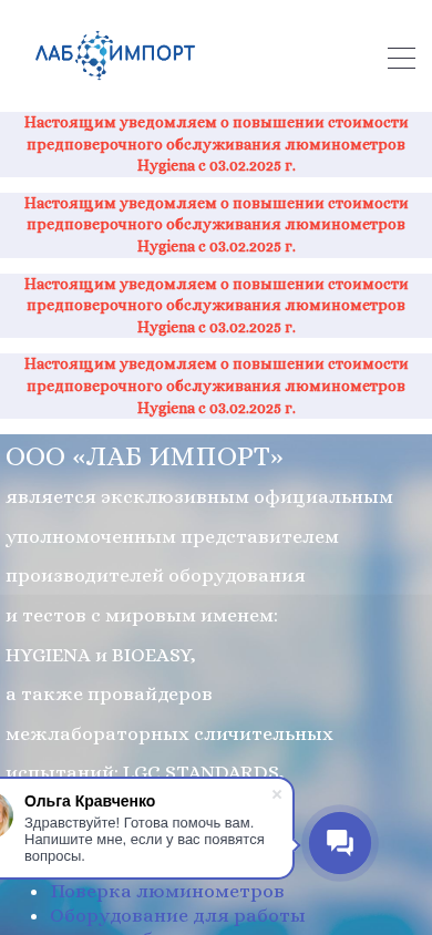 | SEO-описание | ООО «ЛАБ ИМПОРТ» является эксклюзивным официальным уполномоченным представителем производителей оборудования и тестов с мировым именем: HYGIENA и BIOEASY, а также провайдеров межлабораторных сличительных испытаний: LGC STANDARDS, TEST VERITAS, APHA и др. |