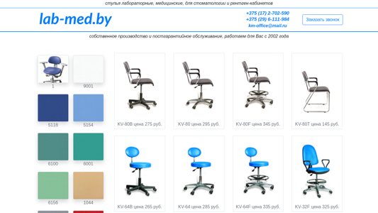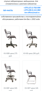 | AI-анализ | --- This online resource, Lab-Med.by, specializes in laboratory and medical chairs for various applications, including stomatology and X-ray cabins. The website provides information on three distinct models: KV-80B, KV-80, and KV-80F. All chairs are produced in-house and come with post-warranty service, with the company having operated since 2002. The KV-80B chair, priced at 275 rubles, is made using medical-grade coatings that allow for surface treatment with various disinfecting agents. It features adjustable height and comes with wheeled casters equipped with rubber tires. The chair includes a black plastic crossbar. The KV-80 chair, also priced at 295 rubles, follows the same design but includes a chrome |