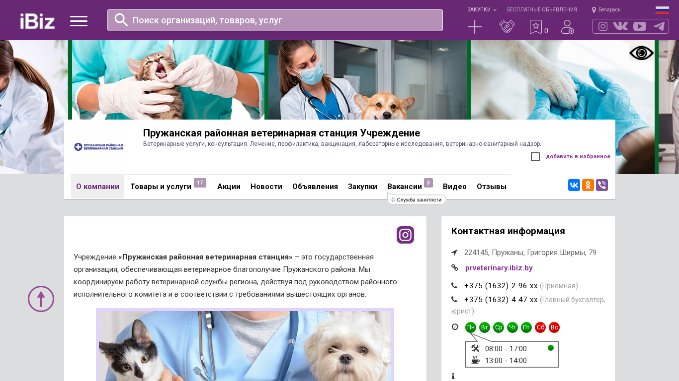 | Название / Заголовок | Пружанская районная ветеринарная станция Учреждение - Ветеринарные услуги, консультация. Лечение, профилактика, вакцинация, лабораторные исследования, ветеринарно-санитарный надзор.. 224145, Пружаны, , Григория Ширмы, 79 |