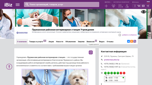 | AI-анализ | This website is the official page of the Pruzhansky District Veterinary Station, an institution in Belarus providing veterinary services, consultation, treatment, prevention, vaccination, laboratory research, and veterinary-sanitary surveillance. The address is located at 224145, Pruzhany, Grygoria Shirmy, 79. The website includes a map, contact phone numbers, and the organization's name and address. The main services offered are veterinary services for animals, with a focus on healthcare, prevention, and sanitation. The institution operates under the jurisdiction of the Pruzhany District Executive Committee and adheres to national and international standards. The goal is to ensure animal health and safety, protect public health, and maintain the quality of livestock and animal products. The website also features sections for company information, products and services, news, and announcements. |