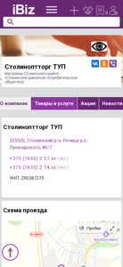 | AI-анализ | The website stolinopttorg.ibiz.by is for the consumer cooperative, Stolinopttorg TUP, located in the city of Речица, Belarus, at the address Луначарского, 86/7. The website provides information on the company, its products and services, which include promotorian markets. Contact information for the company includes two phone numbers, +375 (1655) 2 27 xx and +375 (1655) 2 74 xx, and the Unified State Register number 290387275. The website also offers various categories for browsing, such as companies, news, announcements, vacancies, videos, and reviews on social media platforms VKontakte, Odnoklassniki, and Viber. The operating hours for the company |