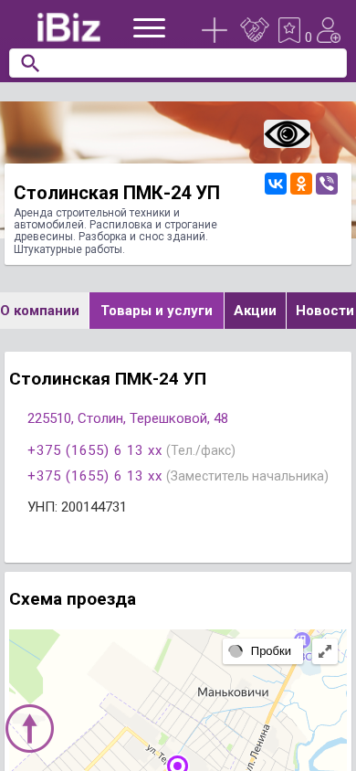 | Название / Заголовок | Столинская ПМК-24 УП - Аренда строительной техники и автомобилей. Распиловка и строгание древесины. Разборка и снос зданий. Штукатурные работы.. 225510, Столин, , Терешковой, 48 |