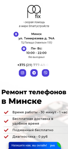 | AI-анализ | The portal Pa fix BY is an e-commerce website offering quick repair services for smart devices in Minsk, Belarus. The website is located at ul. Timiryazeva 74A, Palazzo shopping center (pavilion 155), and provides services from Monday to Sunday, 10:00 to 22:00, without holidays. Customers can contact the business via Instagram, Telegram, or Viber. Repairs include screen replacement, display module replacement, battery replacement, back cover replacement, camera glass replacement, and connector replacement, with prices starting from 25 rubles for camera glass replacement. Diagnosis is free, and delivery within the city of Minsk is also free of charge. The business offers a 12-month guarantee on all repairs and parts. Customers can leave a request for services and receive a free gift with a pemont |