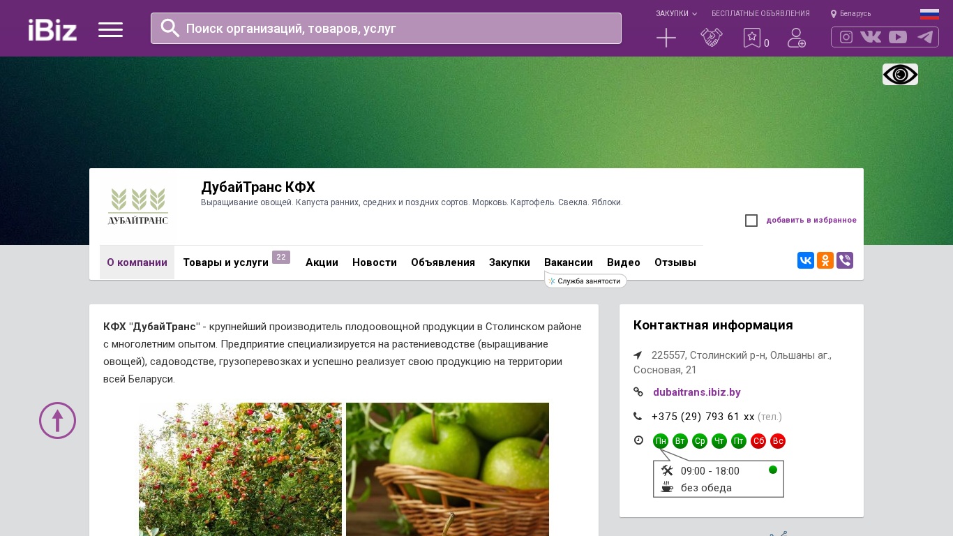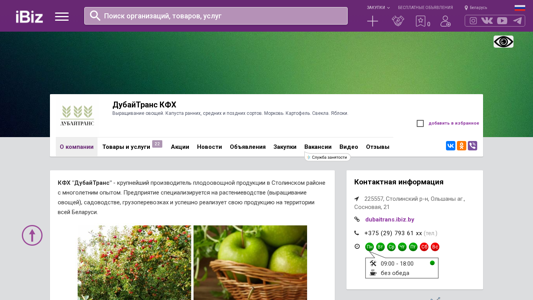 | AI-анализ | This online resource is for DubaiTrans KFH, a farming business specializing in the cultivation of various vegetables including cabbage (early, medium, and late varieties), carrots, potatoes, beets, and apples. The website provides a map for navigation, contact information, and the address of the company located in the Olszany agricultural association, Sosnovaya, 21. DubaiTrans KFH is a significant producer of fruit and vegetable products in the Stolin district with a long-standing experience. The business deals with agriculture (vegetable production), horticulture, cargo transportation, and successfully sells its products across Belarus. DubaiTrans KFH offers a wide range of cultivated produce: potatoes, cabbage, carrots, beets, and apples. The company engages in wholesale sales of high-quality produce at reasonable prices |