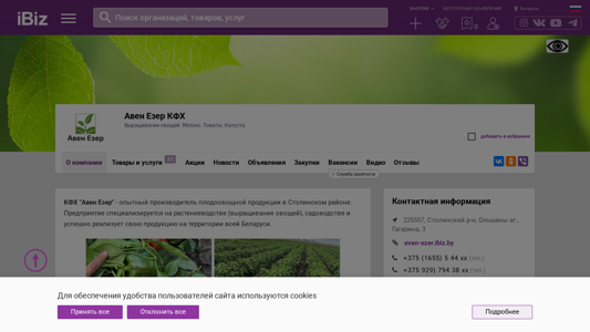 | Название / Заголовок | Авен Езер КФХ - Выращивание овощей. Яблоко. Томаты. Капуста.. 225557, , Ольшаны аг., Гагарина, 3 |