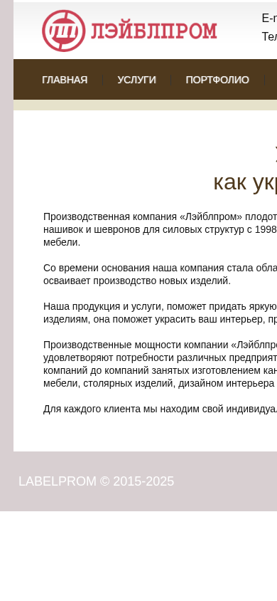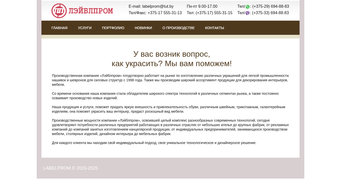 | AI-анализ | The web project "У вас возник вопрос, как украсить? Мы вам поможем!" | ЛЭЙБЛПРОМ is a Belarusian production company specializing in the manufacture of various decorative items for the light industry, embroidery and badges for law enforcement agencies. Since 1998, the company has been producing a wide range of products for decorating interiors and furniture. With the passage of time, the company has acquired a wide range of technologies in various market segments and continuously develops the production of new items. The company's products and services can give a bright and attractive appearance to footwear, various textile, clothing and accessories items, and help decorate interiors and make furniture look luxurious. The production capabilities of "Лэйблпром" meet the needs of various businesses operating in different industries, |