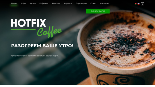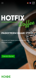 | AI-анализ | --- The website Hotfix.by is a coffee shop and café offering various coffee and tea beverages. The title is 'Hotfix' and the top keywords include 'byn', 'кофе' (coffee), 'напиток' (beverage), 'капучино', 'латте', 'эспрессо', and 'меню' (menu). The description mentions 'РАЗОГРЕЕМ ВАШЕ УТРО!' (Wake Up Your Morning!) and invites visitors to download a coffee catalog. The main menu includes 'Меню' (Menu), 'Кофе' (Coffee), 'Акции' (Sales), 'Кофейни' (Cafes), 'Новости' (News), 'Карьера' (Career), 'Партнерам' ( |