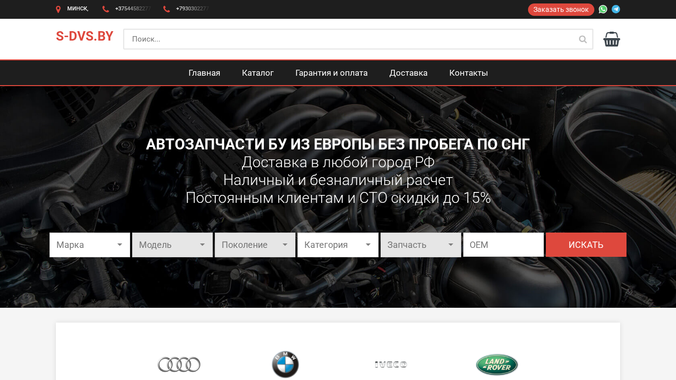 | AI-анализ | The portal S-DVS offers used auto parts for sale in Moscow, Belarus. Visitors can place a call or submit a request for a call back. The menu includes sections for the main page, catalog, guarantee and payment, delivery, contacts, and feedback. The website caters to both legal and individual entities, and accepts various forms of payment. It offers discounts to regular customers and auto repair shops. The site lists vehicles in dismantling, including the Volkswagen Transporter (T5) and Mercedes-Benz M-Class (W166), among others, with detailed information on each model. The company claims to save buyers more than 20% by working directly with European auto salvage yards and selling parts without mileage. The website provides a full package of documents and a guarantee on parts for 30 days from purchase. It also offers consultations and accepts orders for callbacks |